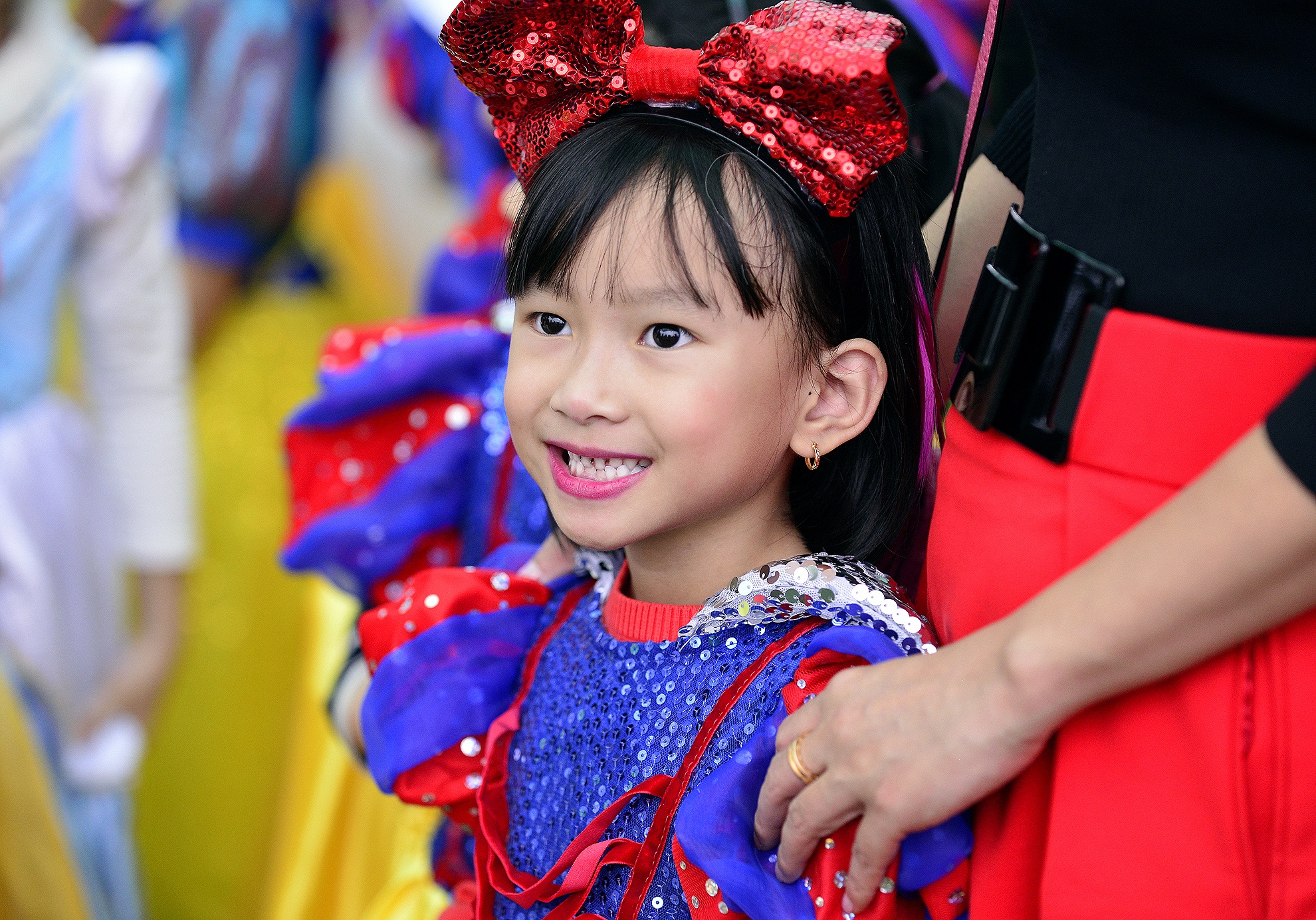| Bé Nhi (8 tuổi) vui vẻ khi được bố mẹ đưa đi tham dự ngày hội. Cô bé chuẩn bị tham gia diễu hành quanh trường cùng các bạn. |