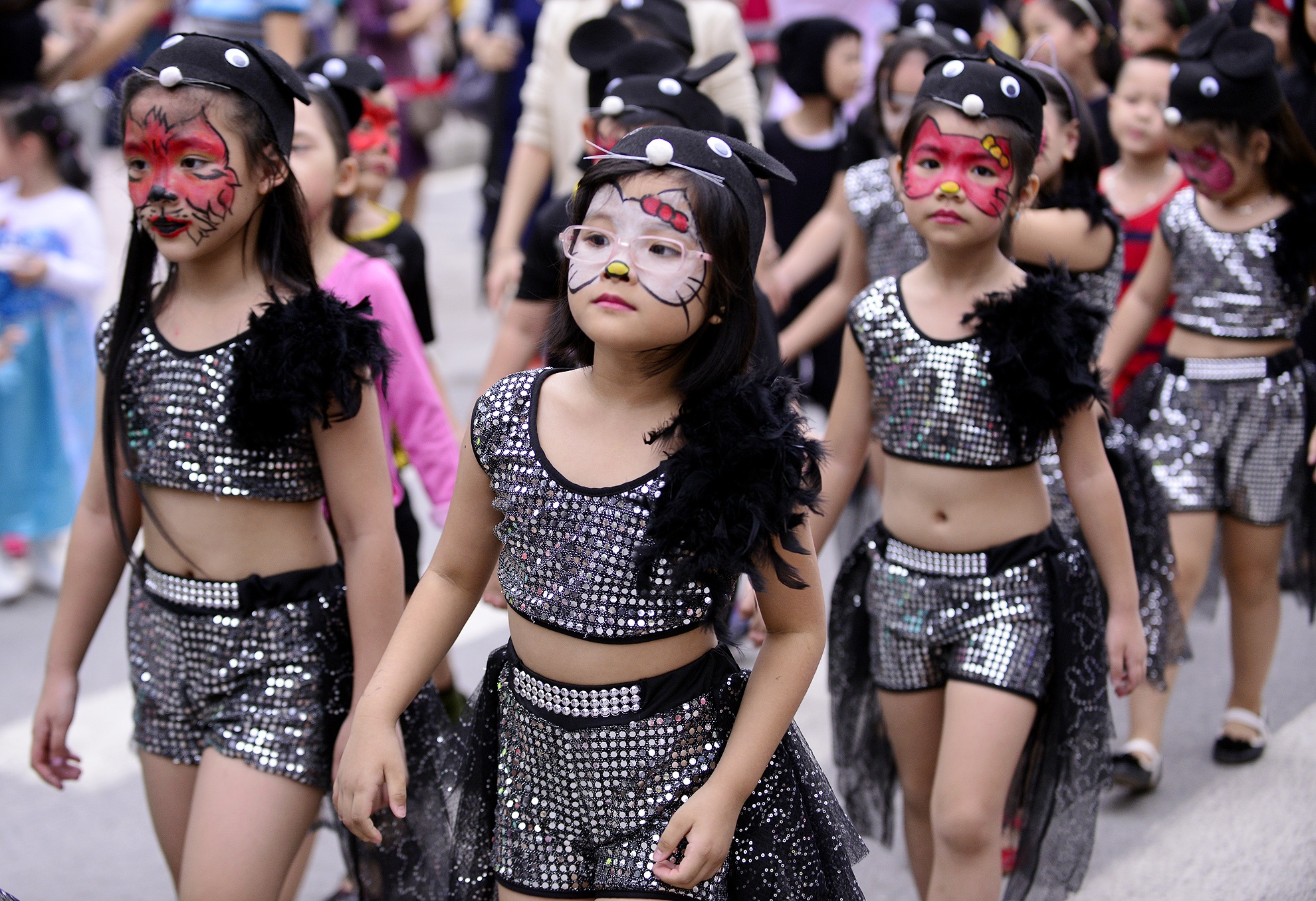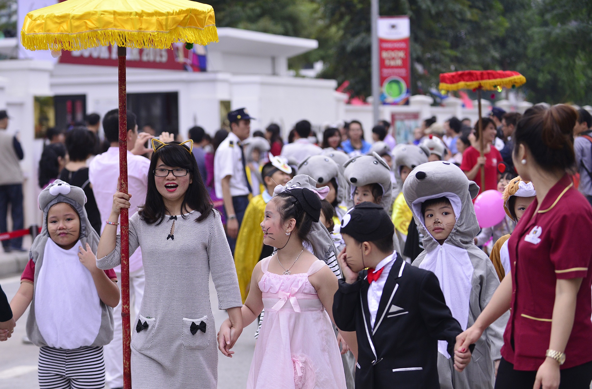 | Tại buổi diễu hành, 1.980 học sinh từ lớp 1 đến lớp 4 hóa thân thành nhân vật trong các câu chuyện cổ tích, truyền thuyết Hy Lạp, Ấn Độ, Việt Nam... |