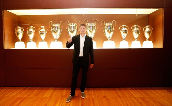 | Kroos chụp hình lưu niệm bên 10 chiếc cúp vô địch Champions League/C1 trong phòng truyền thống của Real. |
