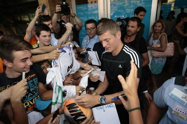 | Toni Kroos có mặt tại phi trường Barajas trước khi chính thức hoàn tất các thủ tục gia nhập Real với mức phí chuyển nhượng 30 triệu euro cùng bản hợp đồng có thời hạn 6 năm. Tại Santiago Bernabeu, Kroos sẽ nhận mức lương khoảng 6 triệu euro/mùa. |
