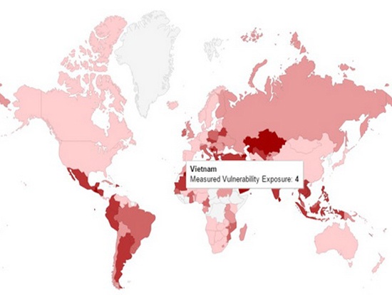 Bản đồ mức độ ảnh hưởng của lỗ hổng "Misfortune Cookie trên toàn cầu, ViệtNam nằm ở mức 4/5 với khoảng hơn 200.000 thiết bị dính lỗ hổng này. |