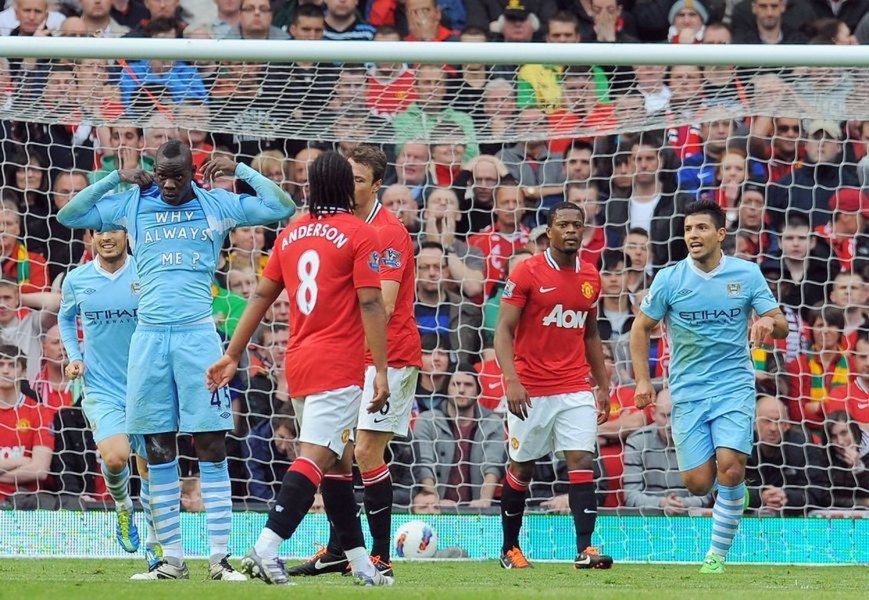 Trong trận derby thành Manchester hồi cuối tháng 10/2010, Balotelli xuất sắc lập một cú đúp giúp Man City đánh bại MU với tỷ số 6-1 ngay tại Old Trafford. Sau pha đệm bóng nhẹ nhàng mở tỷ số, Balotelli vạch áo đấu để lộ áo lót có in dòng chữ “Why Always Me?” (Sao luôn là tôi vậy?) một cách đầy thách thức và kiêu hãnh để ăn mừng cùng đồng đội.