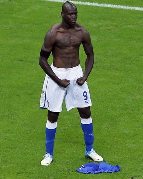 | Tại bán kết Euro 2012, sau khi ghi bàn nâng tỷ số lên 2-0 cho Italia sau pha dứt điểm tuyệt đẹp vào góc cao khung thành thủ môn người Đức - Neuer, Balotelli phấn khích cởi áo ăn mừng bàn thắng. Bad boy gồng mình khoe cơ bắp săn chắc và cứ thế đứng bất động trên sân như một pho tượng. Hình ảnh ăn mừng "cực độc" này sau đó được đóng mác Mario Balotelli. |
