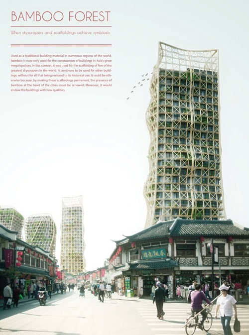 "Bamboo Forest" (Rừng tre) là dự án sử dụng giàn giáo tre làm một phần cố định của tòa nhà, đặc biệt tại châu Á. Lợi ích của vật liệu này là giúp tăng thêm sự ổn định trong các trận động đất và biến tòa nhà trở thành một rừng tre dọc. Tác giả: Thibaut Deprez (Pháp) |