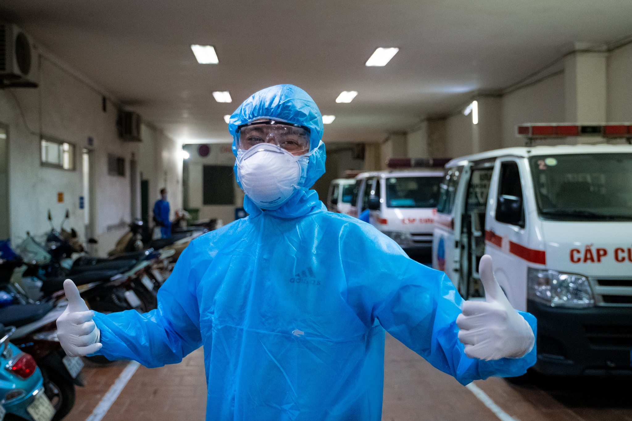 Xe cấp cứu dừng trước cửa nhà, chờ cán bộ y tế phường mang giấy tờ chuyển người nghi nhiễm đến Bệnh viện Đức Giang cách ly. Vài người hàng xóm hiếu kỳ nhìn theo "những người ngoài hành tinh". "Mặc kín mít một màu xanh từ đầu đến chân, ngày đầu mọi người còn trêu nhau nhìn như phi hành gia", lái xe Thành nói.