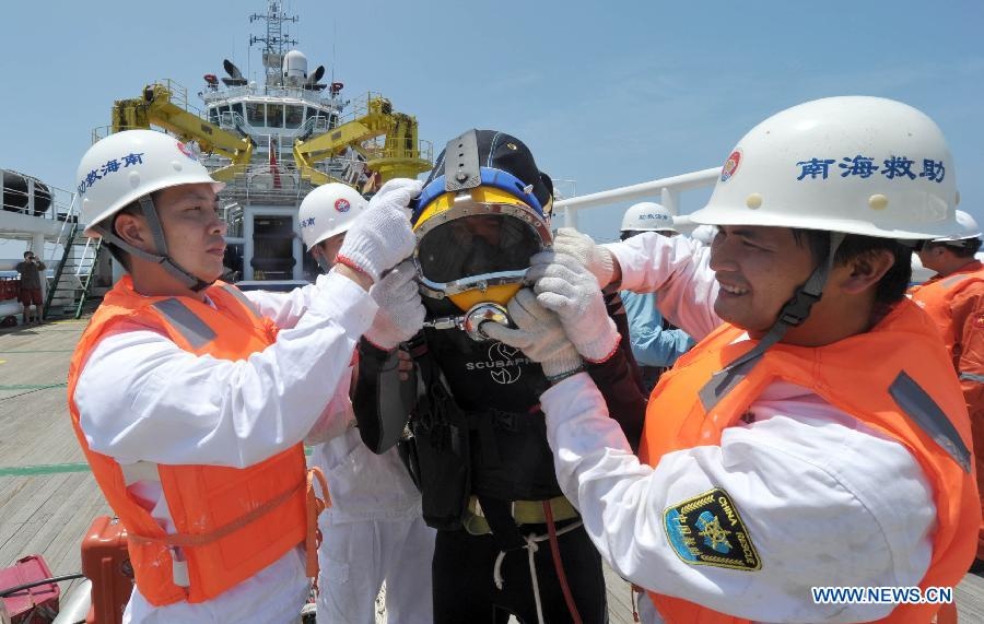 | Thợ lặn Trung Quốc chuẩn bị tìm máy bay Malaysia mất tích trên Biển Đông vào ngày 11/3. Ảnh: Tân Hoa Xã |