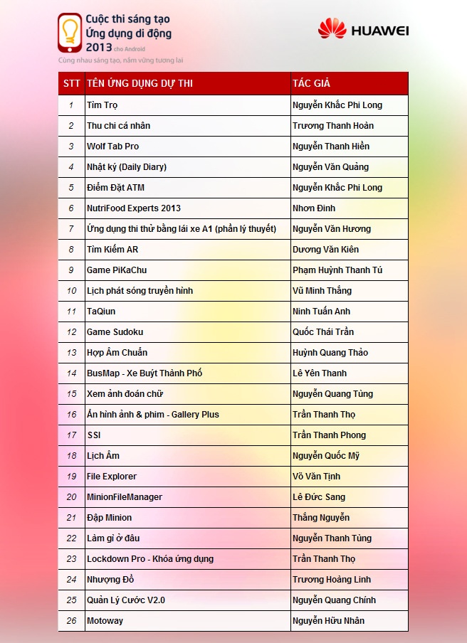 Kể từ khi phát động vào tháng 11/2013, Sáng tạo ứng dụng di động 2013 đã trở thành sân chơi yêu thích của các bạn sinh viên đam mê công nghệ trên khắp cả nước. Cuộc thi đã tạo nên một môi trường sáng tạo và có tính tương tác cao. Các thí sinh có thể đăng tải ứng dụng để cộng đồng tải về dùng thử và cùng góp ý để hoàn thiện hơn. Ngoài tổng giá trị giải thưởng lên đến 50.000 USD (1 tỷ đồng), trong đó giải nhất lên đến 200 triệu đồng, các sinh viên ưu tú đạt giải cao còn được lựa chọn tham gia các chương trình đào tạo cũng như ưu tiên xem xét tạo cơ hội tốt nhất vào làm việc tại tập đoàn công nghệ Huawei toàn cầu.