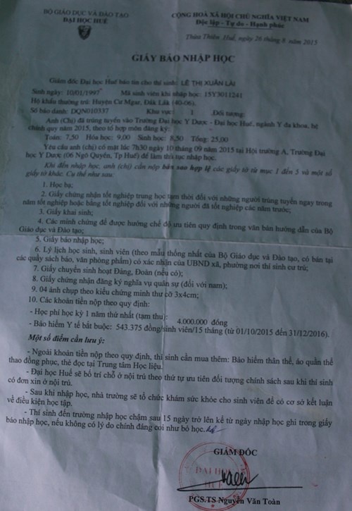Theo giấy báo trúng tuyển mà ĐH Huế thì số điểm các môn Toán: 7,5; Hóa: 9; Sinh: 8,5 (Tổng điểm 25). Theo hộ khẩu thường trú, Lài thuộc KV1 nên được cộng thêm 1,5 điểm ưu tiên khu vực. Tổng số điểm cộng cả điểm ưu tiên khu vực của Lài là 26,5, vừa đủ điểm đỗ vào ngành Y Đa khoa, ĐH Y Dược – ĐH Huế.