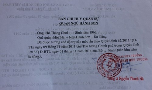 Cần phải nói thêm rằng ông Hồ Thăng Chơi (bố của Như) được Ban chỉ huy quân sự quận Ngũ Hành Sơn, thành phố Đà Nẵng xác nhận là chiến sĩ quân tình nguyện Việt nam chiến đấu tại chiến trường Campuchia và đã được hưởng chế độ trợ cấp một lần theo quyết định 62/2011/QĐ – TTg ngày 9/1/2011 của Thủ tướng Chính phủ trong quyết định 1913/QĐ – BTL ngày 01/11/2014 của Bộ tư lệnh Quân khu 5.