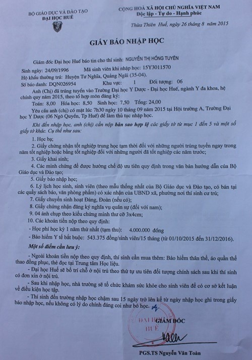 Tương tự trường hợp của Hồ Thị Huỳnh Như là trường hợp của em Nguyễn Thị Hồng Tuyên (hộ khẩu thường trú tại Tư Nghĩa, Quảng Ngãi). Tuyên đăng kí xét tuyển vào ngành Y Đa khoa, ĐH Y Dược - Đại học Huế với tổng điểm là 24. Theo giấy báo nhập học, Tuyên thuộc khu vực 1; đối tượng 06 nên tổng điểm của em là 26, 5. Với số điểm này Tuyên đã trúng tuyển vào ngành Y Đa khoa.