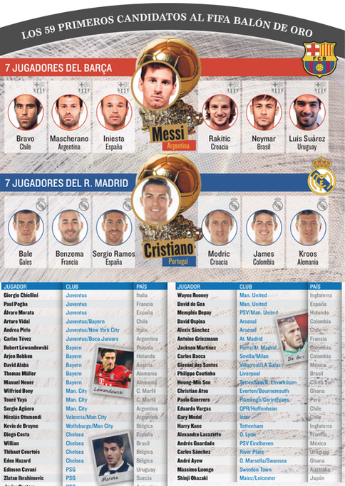 Năm nay, Real Madrid và Barcelona thống trị danh sách ứng viên cho giải thưởng Quả bóng vàng FIFA 2015 khi cùng có 7 cầu thủ. Trong khi, Juventus đứng vị trí thứ hai với 6 ngôi sao, còn Bayern có 5 cầu thủ. Đây là 4 đội bóng vào bán kết Champions League mùa trước.