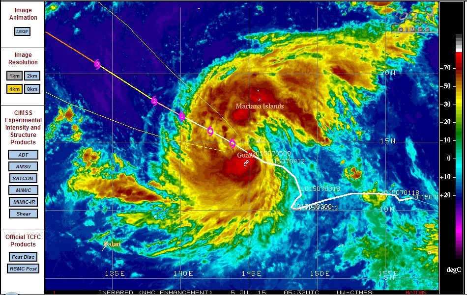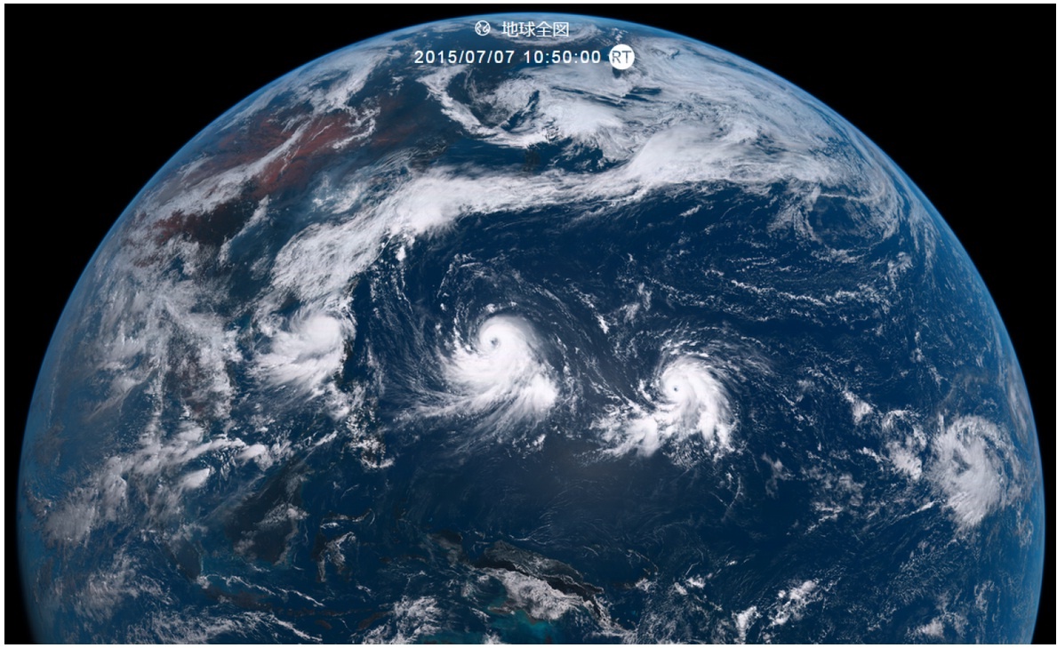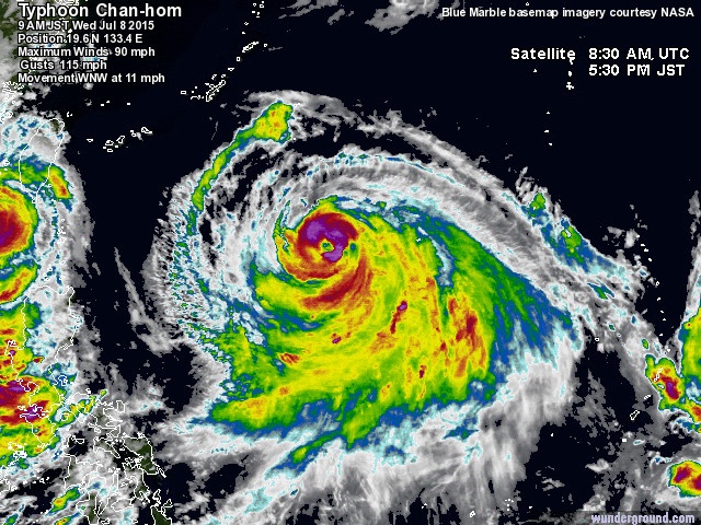 Ảnh vệ tinh cho thấy 3 cơn bão mạnh đang hoành hành trên Thái Bình Dương, trong đó bão Linfa đang ở gần đất liền. Tính đến ngày hôm nay, bão Chan Hom nằm cách căn cứ không quân Kadena, Okinawa, Nhật Bản gần 1.000 km về phía đông nam. Sức gió mạnh nhất ở gần tâm bão đạt 184 km/h. Tại Việt Nam, Lindfa được gọi là bão số 2. |
