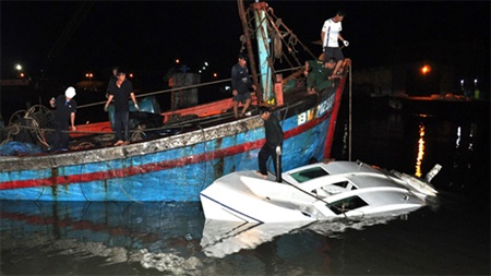 | Xác canô H29-BP được kéo về tại cảng gần nhà máy đóng tàu của Công ty cổ phần công nghệ Việt - Séc (Vũng Tàu) lúc 20h ngày 3/8 |