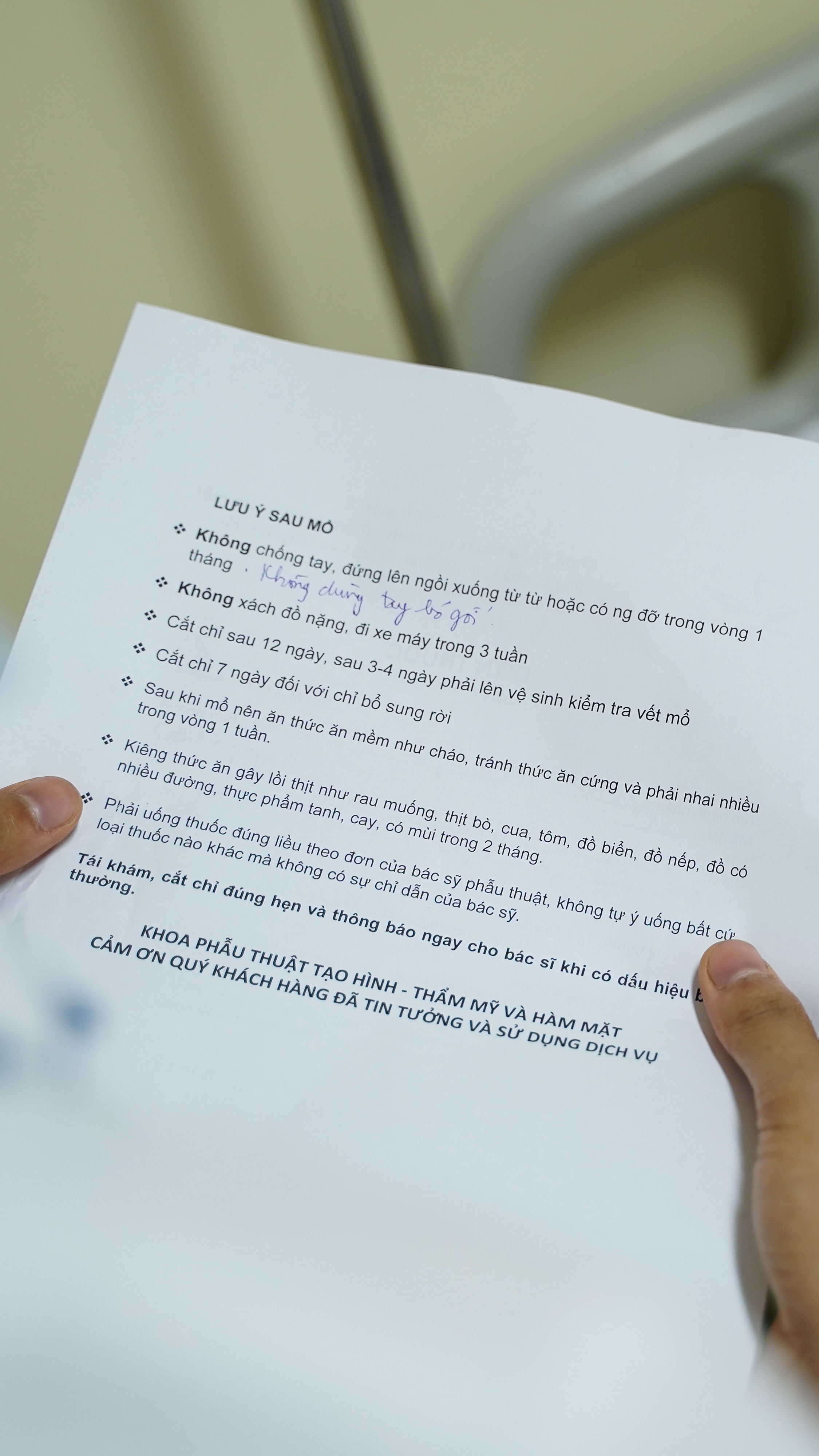 | Tới ngày thứ 7 sau phẫu thuật, Ngọc sẽ quay lại bệnh viện cắt chỉ. Mọi hoạt động hàng ngày có thể trở về bình thường sau 4-6 tuần. |