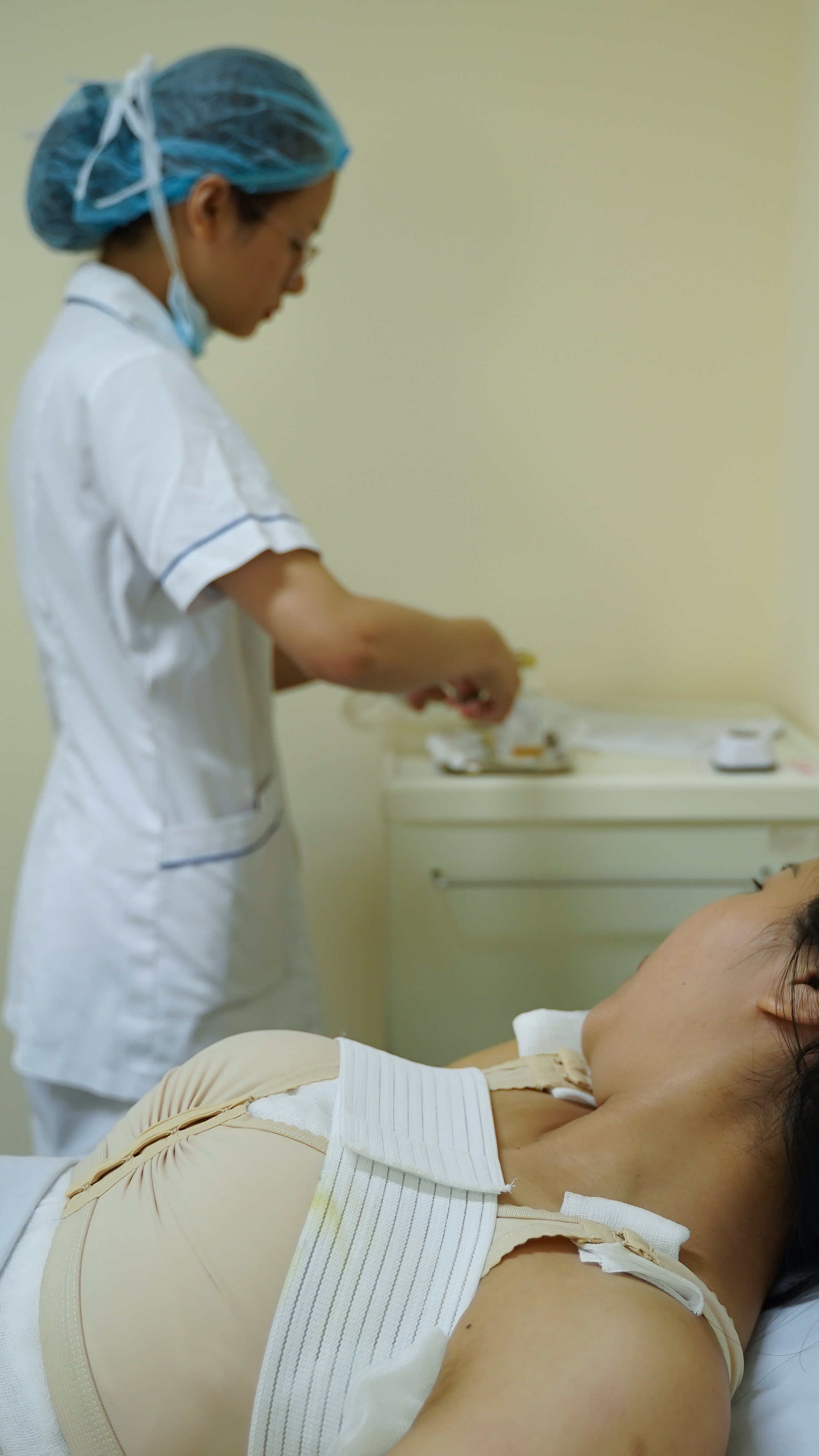 | Ở bước cuối cùng của ca phẫu thuật nâng ngực, chúng tôi ngay lập tức mặc áo định hình cho Ngọc để giữ chúng ổn định. |