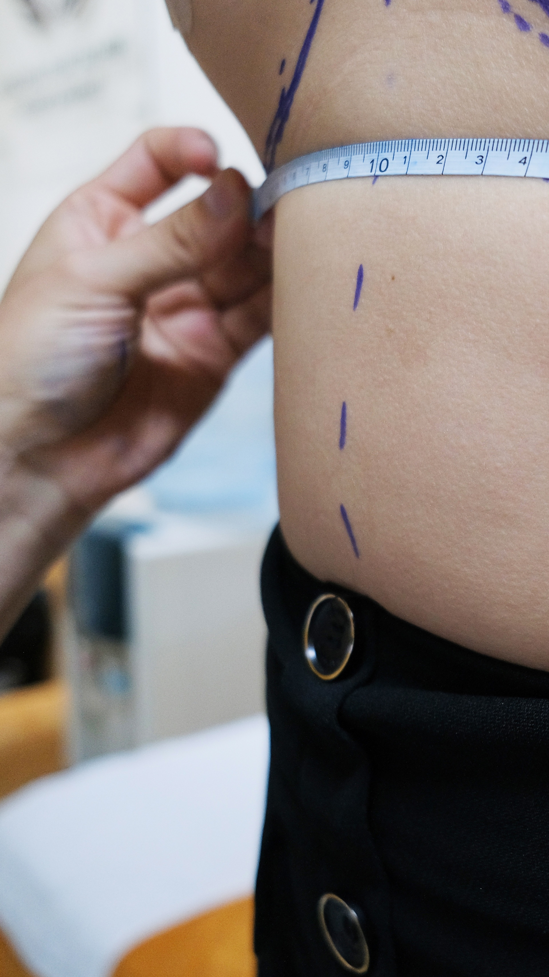 | Sáng hôm sau, trước khi bước vào phòng phẫu thuật, tôi trực tiếp thiết kế và vẽ các đường mổ, khu vực bóc tách trên cơ thể của Ngọc để túi ngực có thể nằm đúng khoang nhất. |