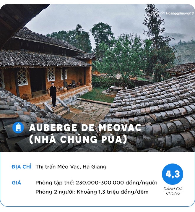 Auberge de Meovac hay còn có tên gọi Chúng Pủa, nằm trong một con ngõ nhỏ ở trung tâm thị trấn Mèo Vạc. Là ngôi nhà hơn 100 tuổi của người H'mong được phục dựng, homestay vừa mang nét truyền thống đậm nét, vừa đầy đủ tiện nghi sinh hoạt hiện đại.
