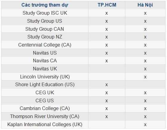 Hội thảo và phỏng vấn trực tiếp với đại diện trường Anh, Mỹ, Cananda, New Zealand cung cấp cơ hội tìm hiểu về đất nước và các cơ hội học tập tại Mỹ, Anh, Canada và New Zealand. Cơ hội gặp gỡ các đại diện trường để trao đổi cụ thể về khoá học.