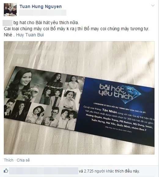 Chỉ một vài tiếng sau khi xuất hiện trong chương trình "Bài hát yêu thích" ngày 17/7, Tuấn Hưng đã khiến dư luận xôn xao khi đăng một status tục tĩu trên mạng xã hội cùng với hình ảnh tấm vé vào cửa. Anh khẳng định sẽ không bao giờ tham dự chương trình này một lần nữa và gắn tên nhạc sĩ Huy Tuấn vào bức ảnh. Tuy không nói rõ nguyên nhân, nhưng ai cũng hiểu rằng Tuấn Hưng không hài lòng khi tên mình bị xếp phía sau các ca sĩ trẻ.