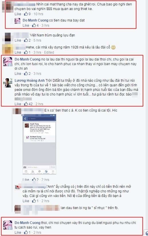 NTK Đỗ Mạnh Cường viết: "Nó là lâu đài thì người ta gọi là lâu đài thôi chị, chứ gọi là cái chi? Chị lớn tuổi rồi, lo cho hạnh phúc cá nhân thay vì ngồi bàn mấy chuyện này đi chị ạ". Hoàng Anh cũng mau chóng trả lời: "Trời đất! tôi thấy ở đó nhà nào cũng như lâu đài thì tôi nói vậy trong Facebook của tôi về một bài báo viết cho công chúng, có liên quan đến giới tính, tôn giáo, chính trị, hạnh phúc, tuổi tác của bạn đâu mà phải nhào vô dạy tôi lo cho hạnh phúc vì lớn tuổi...". Tuy nhiên, Đỗ Mạnh Cường lại là người muốn dừng cuộc khẩu chiến, không nói nữa vì "chị nói chuyện như vậy cũng đủ biết người phụ nữ như chị tư cách như thế nào rồi".