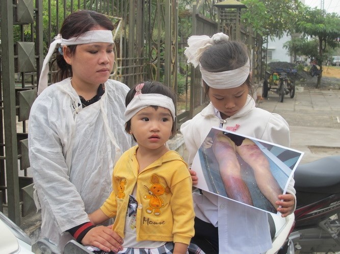 | Kim Oanh ôm di ảnh của cha. Bên cạnh em, bác ruột và mẹ cầm những bức ảnh chụp các vết thương của anh Kiều khi bị các công an đánh. |