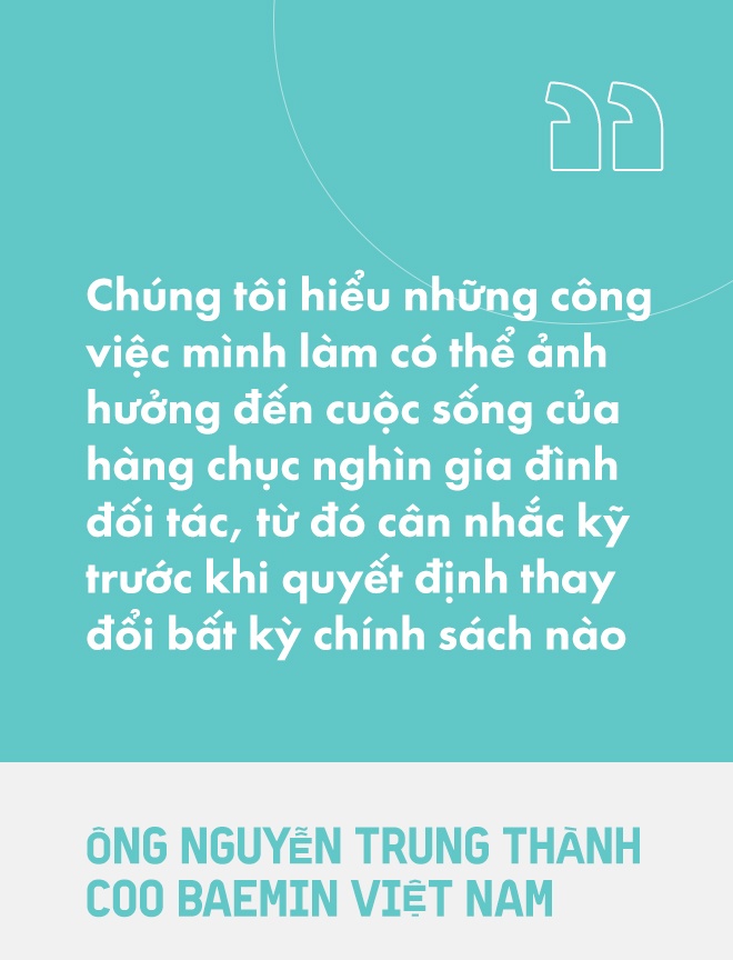 Còn với đội ngũ Baemin, ngoài đáp ứng nhu cầu khách hàng, thì việc làm thế nào để các đối tác cung cấp dịch vụ hài lòng và gắn bó là trăn trở hàng ngày. Đảm bảo tài xế vui vẻ, thu nhập ổn định là trăn trở lớn nhất, và cũng là động lực lớn nhất để chúng tôi đi làm mỗi ngày. Chúng tôi hiểu những công việc mình làm có thể ảnh hưởng đến cuộc sống của hàng chục nghìn gia đình đối tác, từ đó cân nhắc kỹ trước khi quyết định thay đổi bất kỳ chính sách nào.