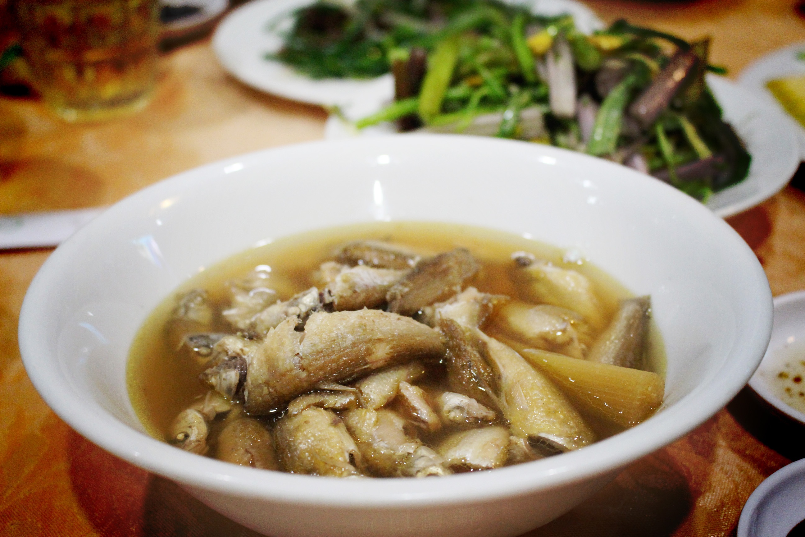 | Cá linh kho mía ăn cùng gỏi bông điên điển. Ảnh: Huỳnh Hằng. |