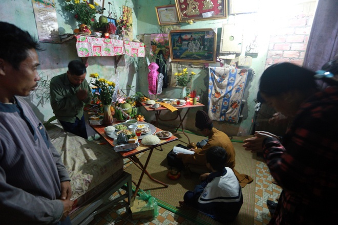 Cách đó không xa là ngôi nhà 2 nạn nhân xấu số khác. Sau khi chôn cất hai nạn nhân Nguyễn Văn Chí (35 tuổi) và vợ là chị Nguyễn Thị Hạnh (30 tuổi), gia đình bắt đầu làm lễ cầu siêu.