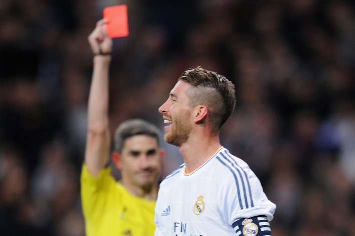 | Trọng tài Undiano Mallenco rút thẻ đỏ truất quyền thi đấu đội trưởng Sergio Ramos. Ảnh: AS |