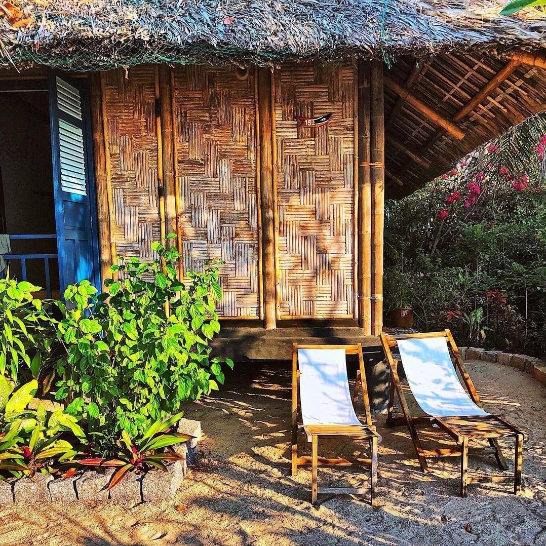 Bên trong các bungalow lợp mái tre truyền thống được trang bị nội thất đơn giản, quạt máy, màn chống muỗi. Combo hai ngày một đêm đang được rao bán với giá khoảng 1,7 triệu đồng/người bao gồm phòng khách sạn, ba bữa ăn, chương trình trekking, hoạt động tắm biển, chèo thuyền kayak...