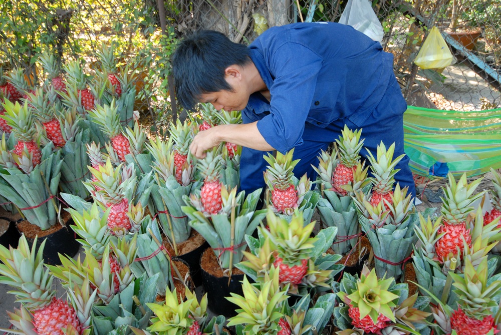 | Thơm là loại kiểng trái được khá nhiều nhà vườn đầu tư dịp Tết này. Ảnh: Ngọc Trinh |