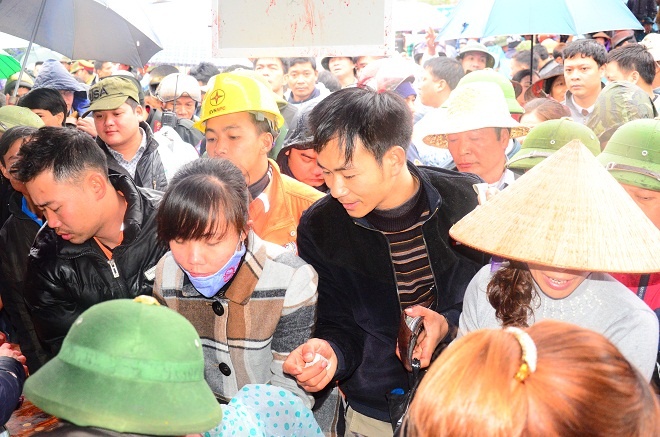 Khoảng 11h, hàng nghìn người có mặt tại khu chợ để mua được thịt trâu chọi đoạt giải, đặc biệt là trâu chọi giành giải nhất, nhì. Năm nay, thịt trâu chọi giải nhất có giá 3 triệu đồng/kg, trâu giải nhì 2 triệu đồng/kg, còn trâu giải ba có giá từ 1 triệu đến 1,5 triệu đồng/kg. So với năm ngoái, giá cả không biến động nhiều, nhưng sức mua cao hơn hẳn, chỉ hơn 1h đồng hồ, thịt “ông cầu” giành giải nhất đã bán hết veo.
