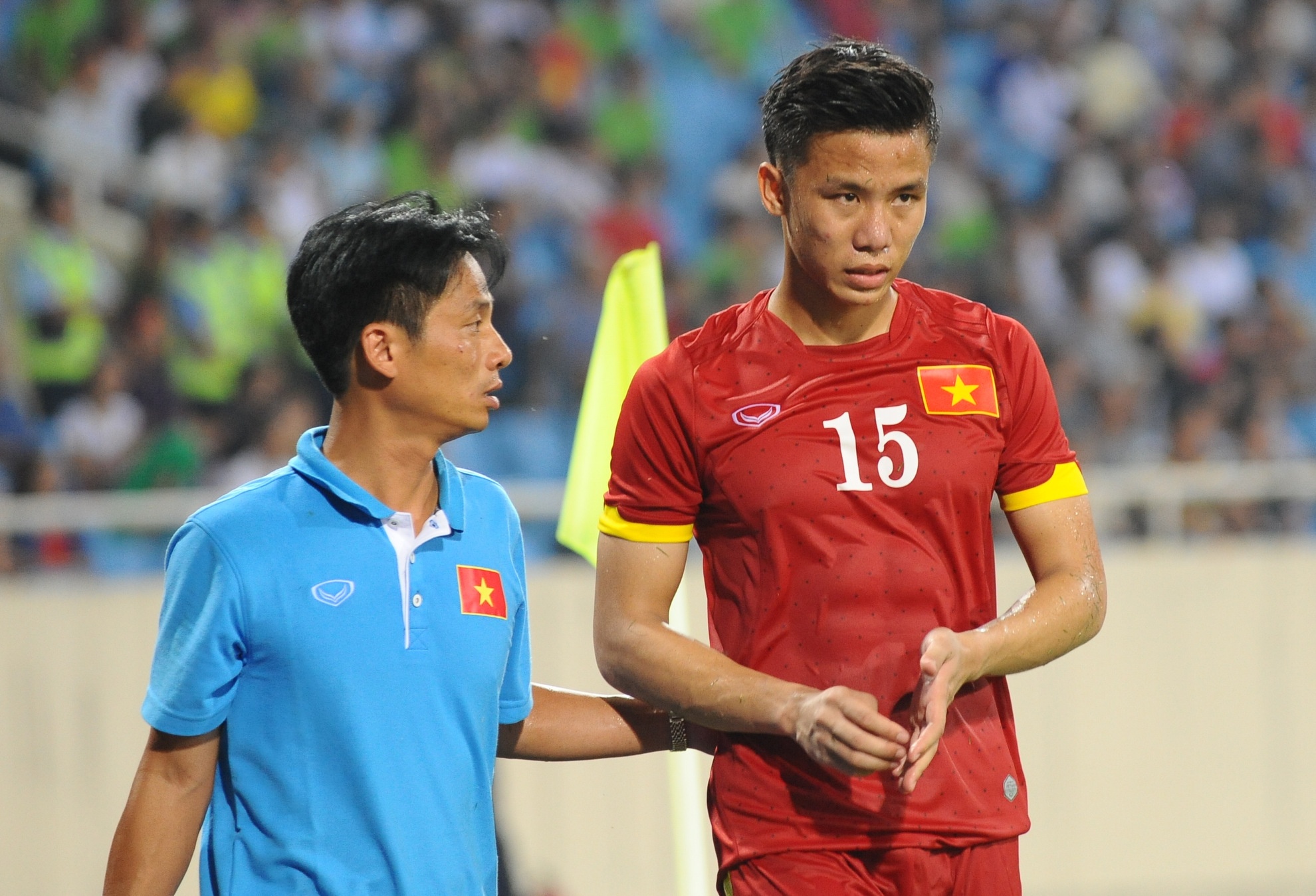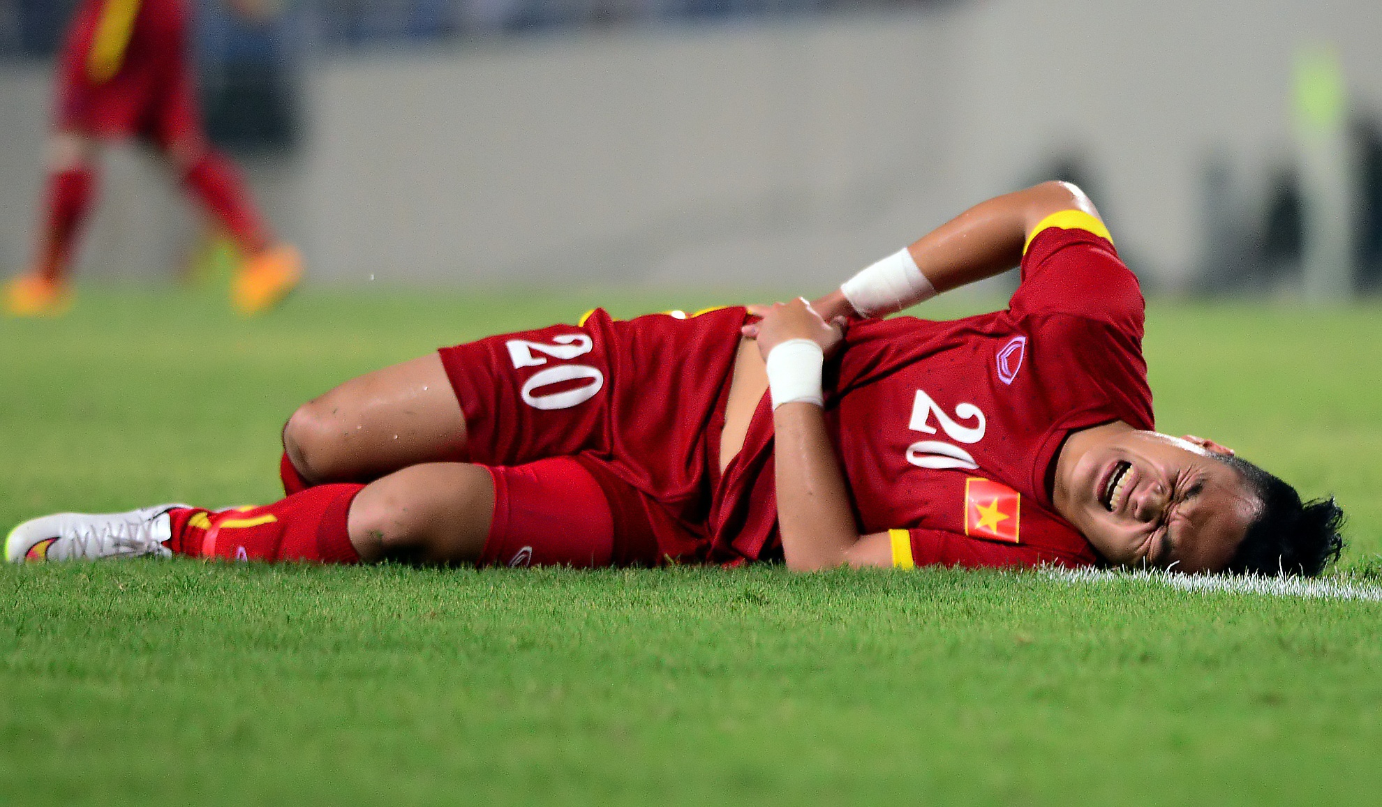 | Các bác sĩ chẩn đoán Ngọc Hải chỉ bị căng cơ nhẹ sau một pha va chạm với tiền vệ của U23 Hàn Quốc. |