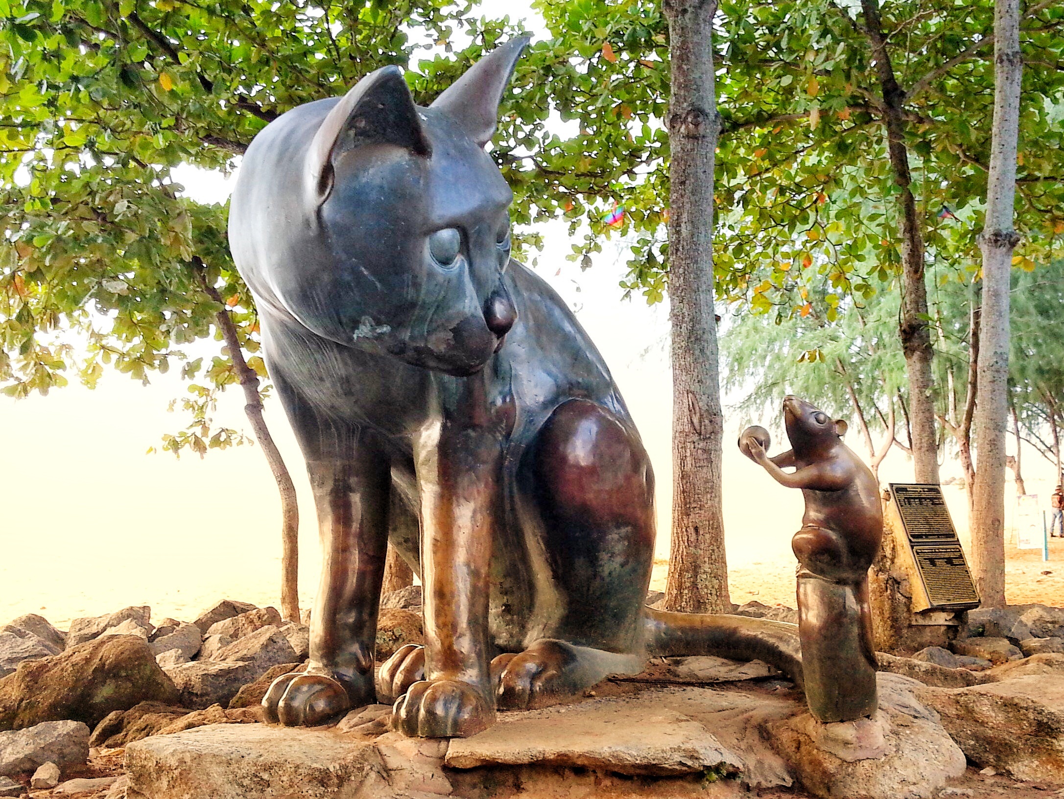 Tại bãi biển Samila ở tỉnh Songkhla, Thái Lan có tượng Mèo và Chuột, thể hiện huyền thoại nổi tiếng ở đây, ngụ ý rằng lòng tham có thể đánh mất những điều quý giá, thậm chí cả mạng sống. Bia cạnh tượng kể: Một thương gia đến Songkhla buôn bán, mua được 2 con chó, mèo, đem nuôi trên tàu. 2 con vật cảm thấy buồn chán, tìm cách trốn. Mèo buộc một con chuột lấy cắp quả cầu ma thuật của vị thương gia để giúp chúng không bị đuối nước. Chuột ngậm quả cầu trong miệng, dẫn đầu cả 3 cùng bơi trở lại Songkhla... Ảnh: Thailand Life. |