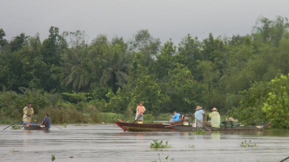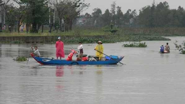 Trong khi nước lũ từ hồ thủy lợi Phú Ninh đổ về chảy rất mạnh ngay ngã 3 sông nguồn, nhưng người dân xóm thuyền vẫn chèo ghe ra dòng sông chảy xiết để đánh lưới, thả lồng.