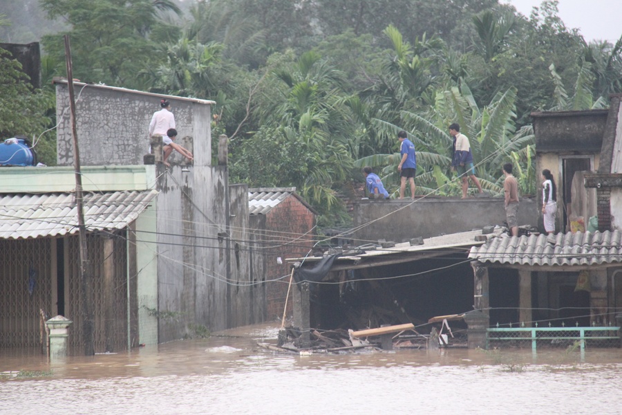 | Nước lũ đến sáng nay, 16/11, vẫn còn bao vây, người dân thị trấn Sơn Tịnh, huyện Sơn Tịnh phải leo lên nóc nhà tránh lụt. |