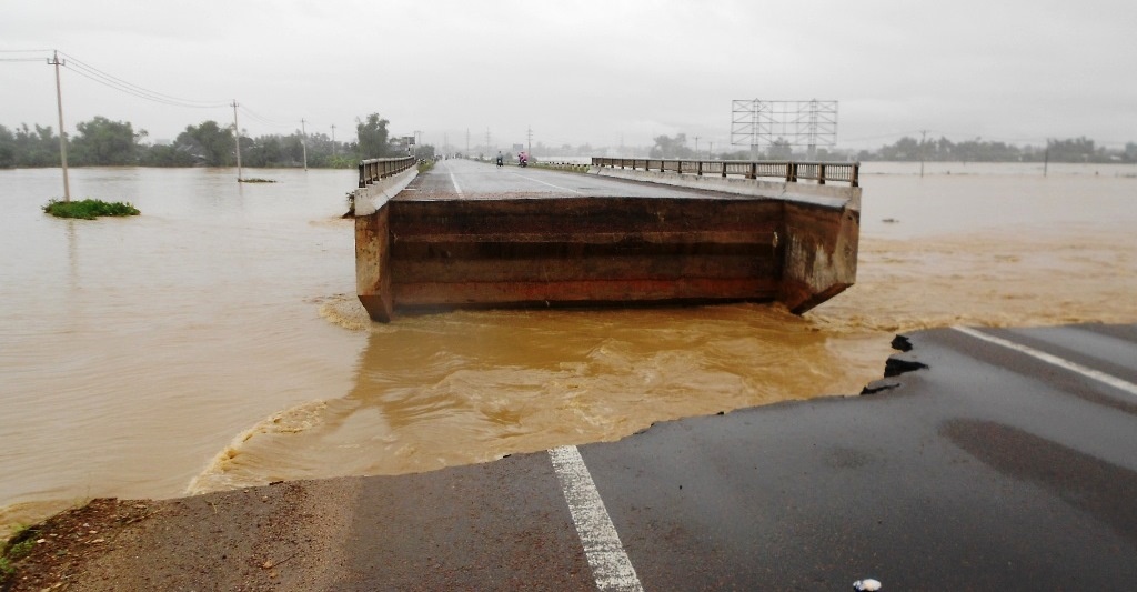 Đến sáng nay, 16/11, nước lũ từ thượng nguồn vẫn đổ về đã nhấn chìm nhiều huyện trong tỉnh Bình Định. Vào lúc 5 h sáng, một cây cầu trên quốc lộ 1a đoạn qua thị xã An Nhơn (Bình Định) bị sập đoạn dài 20m. Khi cầu sập, có 2 người đang đi bên trên nên bị rớt xuống suối sâu. Tuy nhiên, 2 nạn nhân bám được vào cành cây và bơi vào bờ an toàn.