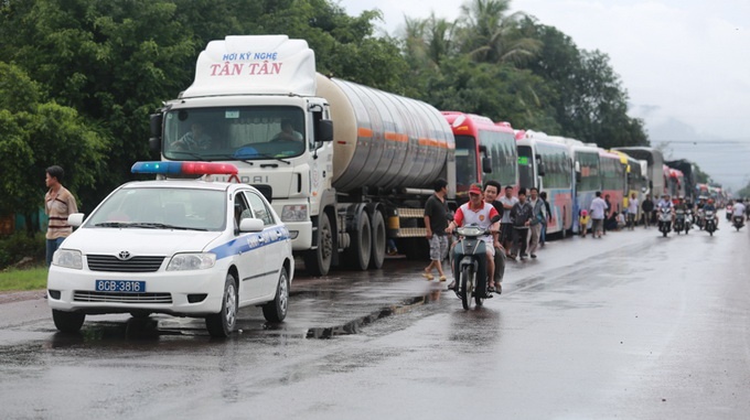 | Hàng ngàn xe bị kẹt dài hơn 5km trên quốc lộ 1A, từ ngã 3 Phú Tài đến cầu Bà Di (Tuy Phước, tỉnh Bình Định) do 2 cây cầu trên tuyến này bị gãy. Ảnh: Tuổi Trẻ |