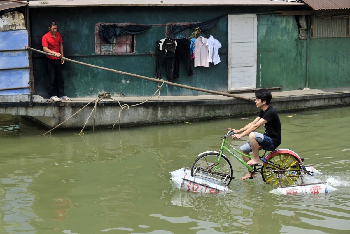 | Lei Zhiqian, một người dân ở thành phố Vũ Hán, tỉnh Hồ Bắc, đang lái một chiếc xe đạp tự chế qua sông Hanjiang vào ngày 16/6/2010. |