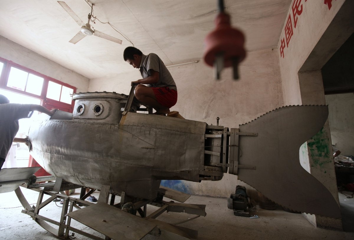 | Một công nhân đang đánh bóng bề mặt của tàu ngầm loại nhỏ tại xưởng sản xuất của Zhang Wuyi, một nông dân yêu thích khoa học ở làng Qingling, ngoại ô thành phố Vũ Hán, tỉnh Hồ Bắc vào ngày 29/8/2011. |