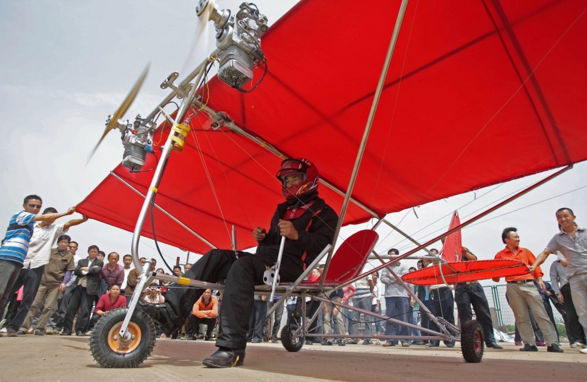 | Shu Mansheng chuẩn bị cất cánh với máy bay tự chế siêu nhẹ trước sự chứng kiến của người dân địa phương ở Vũ Hán, tỉnh Hồ Bắc vào ngày 10/5/2010. |