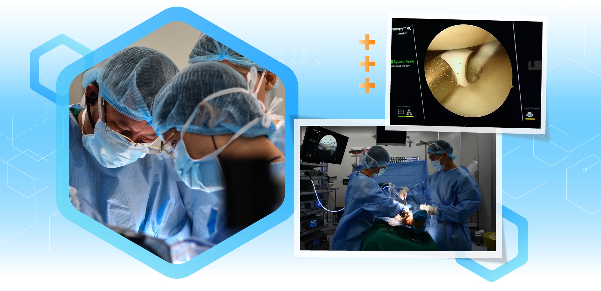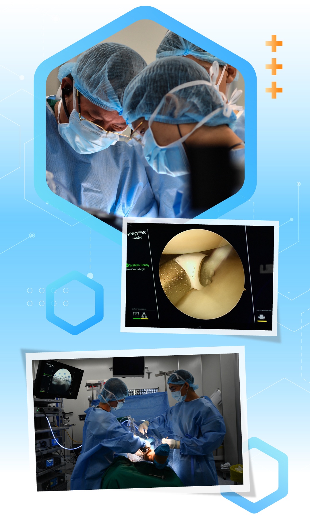 Với chấn thương này, vị chuyên gia quyết định điều trị bảo tồn - dùng kỹ thuật nội soi và hệ thống nội soi hiện đại để thăm khám toàn bộ khớp gối, gồm các bề mặt sụn, dây chằng chéo trước, sau, đồng thời khâu lại sụn chêm bị rách.
