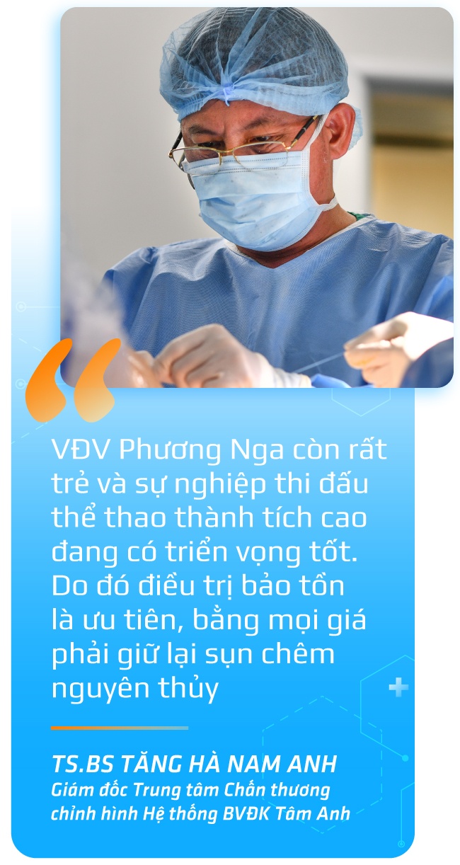 “Với VĐV Phương Nga, cô còn trẻ và sự nghiệp thi đấu thể thao thành tích cao đang có triển vọng tốt. Do đó điều trị bảo tồn là ưu tiên, bằng mọi giá phải giữ lại sụn chêm nguyên thủy”, bác sĩ nói thêm.