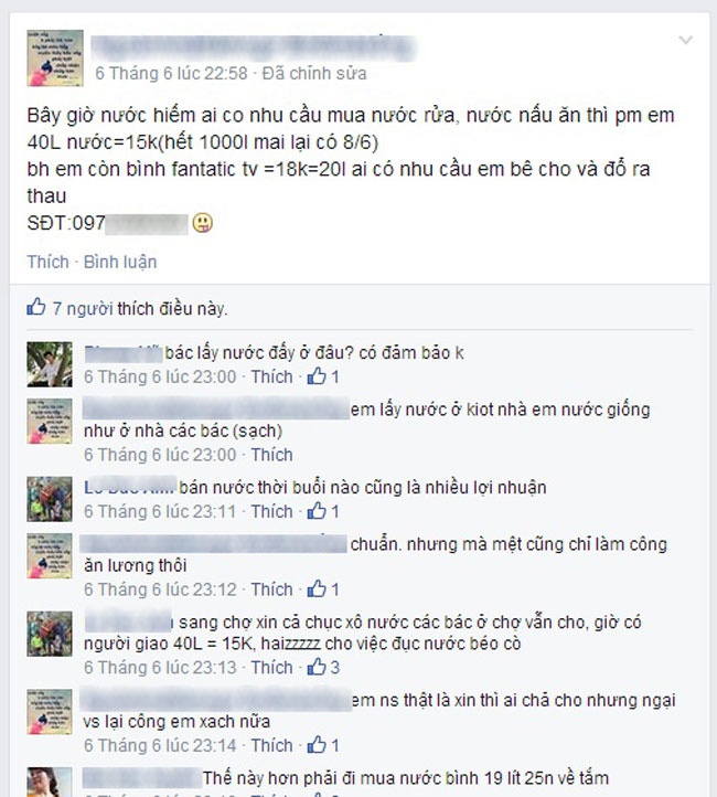 Giá đắt, nhưng nhiều hộ dân ở đây không còn cách nào khác đành phải chấp nhận. "Đúng là đắt, nhưng còn hơn mua nước bình đóng sẵn về tắm. Giá của mỗi bình nước loại 19 lít rẻ nhất cũng từ 18.000 đến 25.000 đồng, tính ra tới 1,3 triệu/m3", chị Ngọc Anh, một cư dân ở đây chia sẻ.