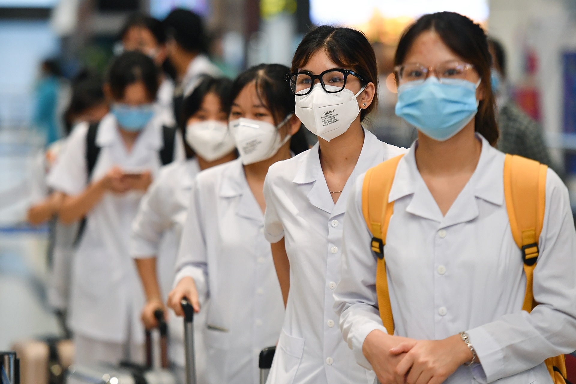 | 5h30 sáng 1/7, tại quầy check-in Cảng hàng không Nội Bài (Hà Nội), 319 sinh viên, giảng viên ĐH Kỹ thuật Y tế Hải Dương xếp hàng làm thủ tục bay tới TP.HCM, chi viện chống dịch Covid-19. |