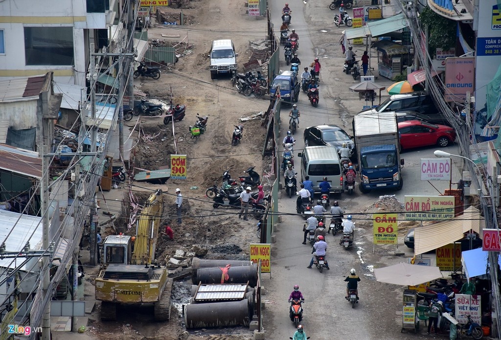 Các tuyến đường đang bị rào chắn thi công gồm Xa lộ Hà Nội, Điện Biên Phủ, Lê Lợi, Tôn Đức Thắng (thuộc dự án tuyến metro Bến Thành Suối Tiên), Bạch Đằng, Hồng Hà (quận Tân Bình), Đỗ Xuân Hợp (quận 9), Nguyễn Văn Quá (quận 12), Trần Não (quận 2), Hồng Bàng (quận 11), Mai Xuân Thưởng, đào kênh Hàng Bàng (quận 6). Ảnh: Lê Quân. |