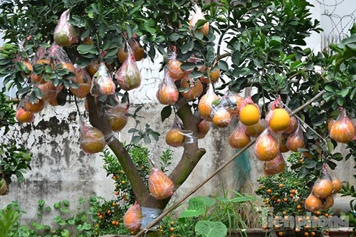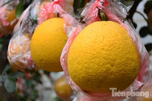 | Những quả bưởi này được bọc rất kỹ bằng nylon, băng dính để tránh va đập, rụng. |