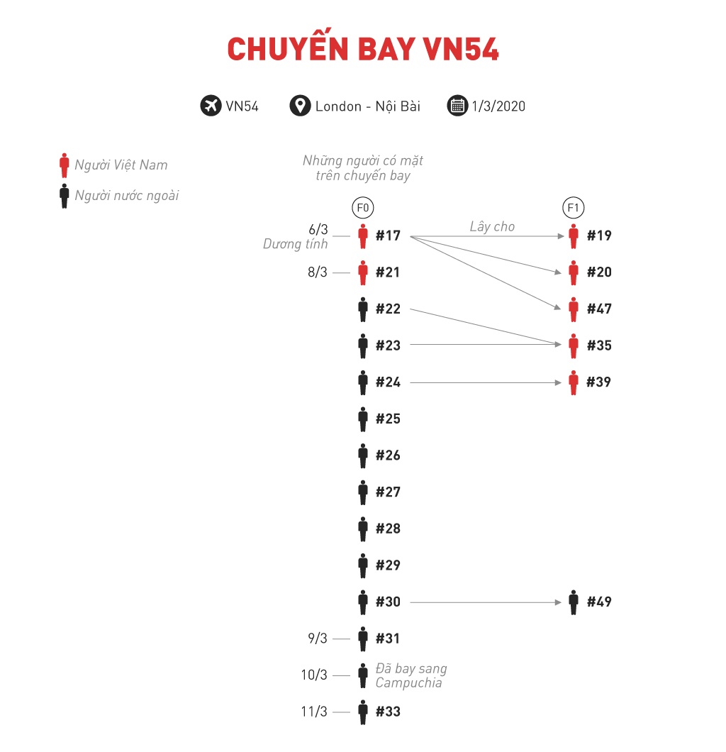 Chuyến bay VN54 về Việt Nam ngày 2/3 có tổng cộng 217 người gồm tổ bay 16 người, 21 khách thương gia, 180 khách phổ thông. Tính đến 14/3 đã có 16 người đi chuyến bay này nhiễm Covid-19.