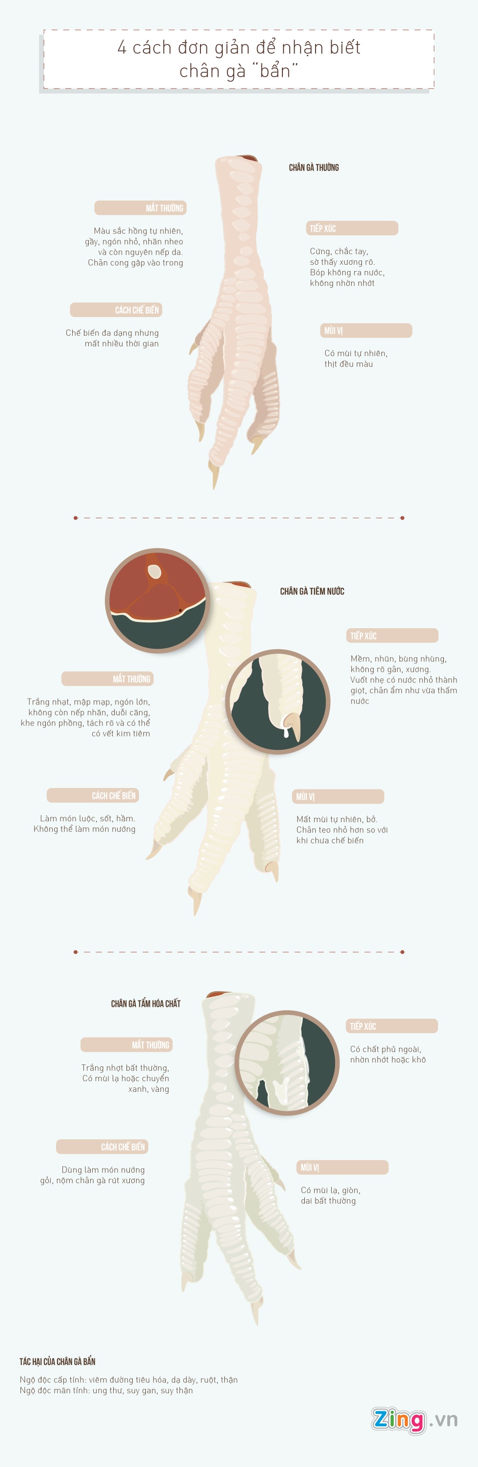 Bằng mắt thường, qua tiếp xúc, cách chế biến hoặc dựa vào các dấu hiệu về mùi vị là những cách đơn giản nhất để nhận biết chân gà "bẩn" có nguy cơ gây độc cho người tiêu dùng.