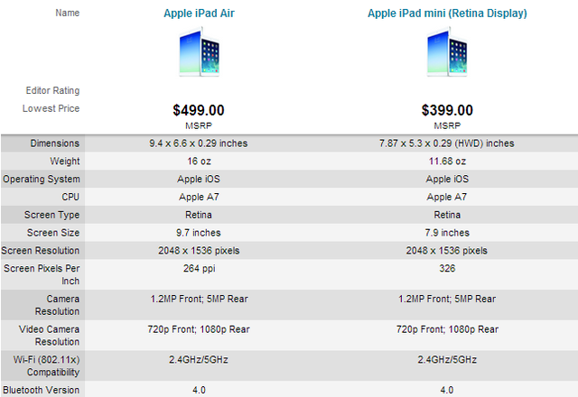 Vậy với nhu cầu giải trí, lướt web, xem phim và chơi game, cả iPad Air và iPad mini đều đáp ứng tốt hơn rất nhiều so với chiếc iPad 2 già cỗi. Như chúng ta đã biết, iPad Air và iPad mini 2 đều được trang bị màn hình độ phân giải 1.536x2.048 pixel sắc nét dù mật độ điểm ảnh của iPad mini 2 có cao hơn một chút. Bên cạnh đó, 2 thiết bị này cũng có rất nhiều điểm tương đồng khác như cùng chạy vi xử lý A7 kiến trúc 64 bit hay hỗ trợ camera trước 1,2 megapixel và camera sau 5 megapixel. Ngay cả thời lượng pin của chúng cũng được Apple hứa hẹn khá cao tới 10 tiếng. Do đó, có chăng điểm khác biệt chỉ là kích thước và mức chênh lệch giá 100 USD.